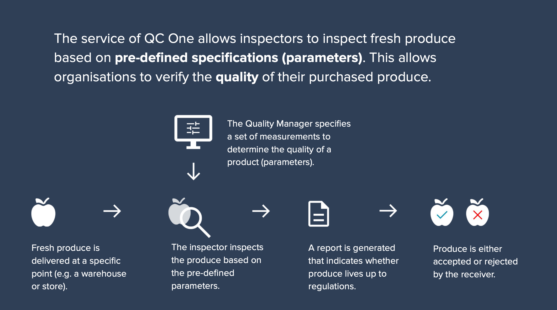 The service of QC One aids inspectors of various organisations in inspecting fresh produce based on pre-defined specifications (parameters). These are set by the Quality Manager of an organisation, based on requirements of all parties involved. The produce is inspected during multiple moments in the product life cycle (for example, upon arrival in the warehouse). A report is generated to show if and how the product lives up to the regulations. This service allows organisations to validate the quality of their purchased produce.
